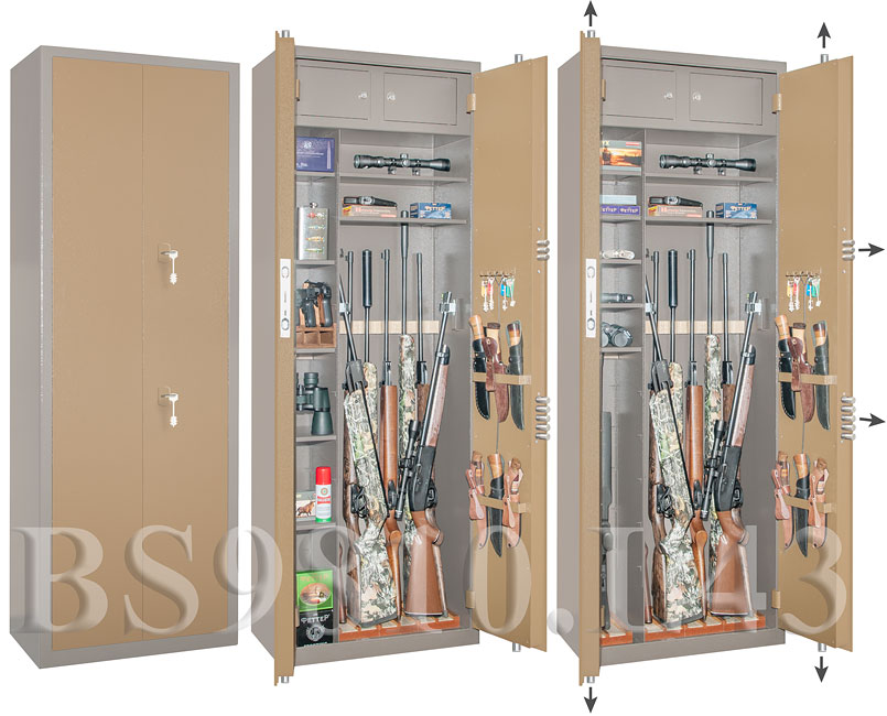 Ружья в сейфе можно хранить как в широкой, так и в узкой области. Сейф дополнительно может быть укомплектован пистолетными ложементами (деревянными либо пластиковыми). Внутренняя поверхность одной из дверей сейфа позволяет хранить на ней ножи, шомпола, связки ключей и т.п.