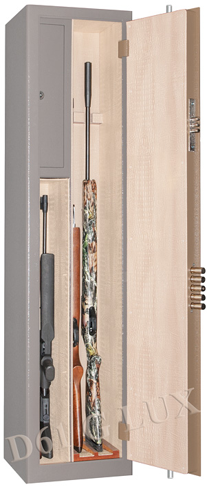 Вертикальное внутреннее запираемое (патронное) отделение с полкой внутри. Ниже находятся две съемные полки. Если не устанавливать полки, то на их месте можно хранить ещё 2-3 ствола. Сейф оборудован нижними и верхними деревянными ложементами, отделанными искусственной кожей.