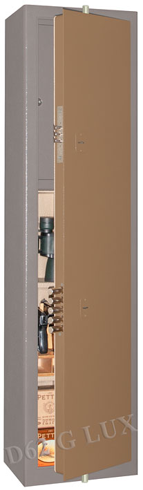 Вертикальное внутреннее запираемое (патронное) отделение с полкой внутри. Ниже находятся две съемные полки. Если не устанавливать полки, то на их месте можно хранить ещё 2-3 ствола. Сейф оборудован нижними и верхними деревянными ложементами, отделанными искусственной кожей.