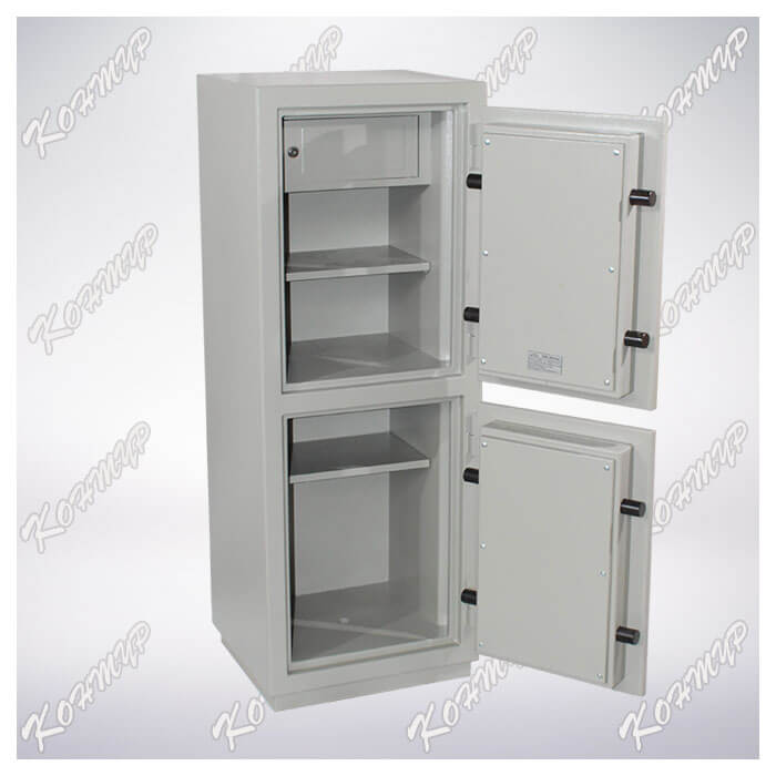 Сейф «КЗ 223т» имеет 2 независимых отделения, запираемых собственной дверью. В верхнем отделении располагается отсек ограниченного доступа (трейзер), запираемый на замок «почтового» типа и одна съемная полка, в нижнем – одна съемная полка.В дне сейфа предусмотрено отверстие Ø11 мм для возможности анкерного крепления его к полу.Каждая дверь сейфа оборудована запорным механизмомс 2-х сторонней ригельной системой запирания (по 2 ригеля Ø28 мм вправо/влево), который блокируется электронным кодовым замком фирмы «CAWI» производства Германии. Петли сейфа наружные, открывание двери – на 180°.