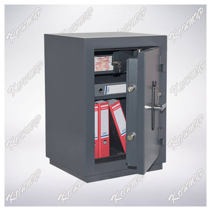 Сейф огневзломостойкий. Корпус сейфа изготовлен из цельнометаллических сваренных корпусов (внешний и внутренний). Пространство между стенками заполнено специальным наполнителем, противостоящим распространению огня и повышенной температуры внутрь сейфа. Система запирания двери имеет 4 активных и один пассивный ригель со стороны петель. Сейф оборудован высококачественным запорным механизмом, который блокируется замком сувальдного типа (производство Германия), что обеспечивает необходимую для первого класса надежность от взлома. Внутри сейфа имеется отсек ограниченного доступа — трейзер (внутренний ящик с замком почтового типа) и 1 полка. Предусмотрена возможность анкерного крепления к полу. Окраска полимерное покрытие.