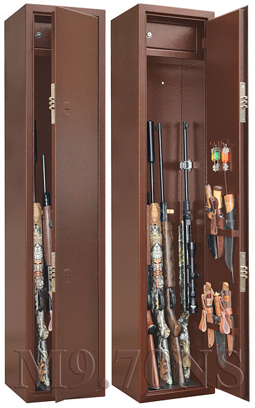 Шкаф имеет внутреннее запираемое отделение. Свободное пространство между внутренним отделением и задней стенкой шкафа позволяет разместить в нем стволы, высота которых практически равна высоте шкафа. Внутренняя поверхность двери этого оружейного шкафа имеет специальные держатели и крючки для хранения ножей, шомполов и др. Дно металлического шкафа отделано ковролином.