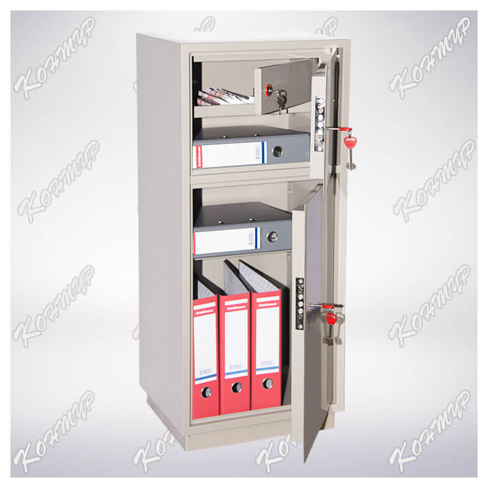 Двери изнутри усилены панелью коробчатого сечения из стального листа толщиной 0,8 мм. В двери шкафа «КБ-042т» установлен врезной цилиндровый замок, а в двери шкафа «КБС-042т» – врезной сувальдный замок. Шкаф имеет подиум (подставку) высотой 47 мм для возможности размещения его вплотную к стене. Петли шкафа – внутренние. Окраска изделия – полимерное порошковое покрытие, цвет серый. По требованию заказчика возможна установка опечатывающего устройства. Гарантийный срок эксплуатации 2 года.