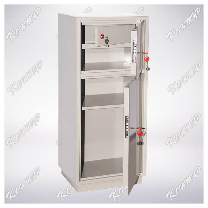 Шкаф представляет собой цельносварную металлическую конструкцию прямоугольной формы, соединение элементов которой выполнены методом сварки сплошным швом по контуру прилегания элементов. Горизонтальная перегородка делит шкаф на 2 независимых отделения, запираемых собственной дверью. В верхнем отделении шкафа располагается отсек ограниченного доступа (трейзер), запираемый на замок «почтового» типа, а в нижнем – 1 съемная регулируемая по высоте полка. Корпус и двери шкафа изготовлены из стального листа толщиной 1,5 мм.
