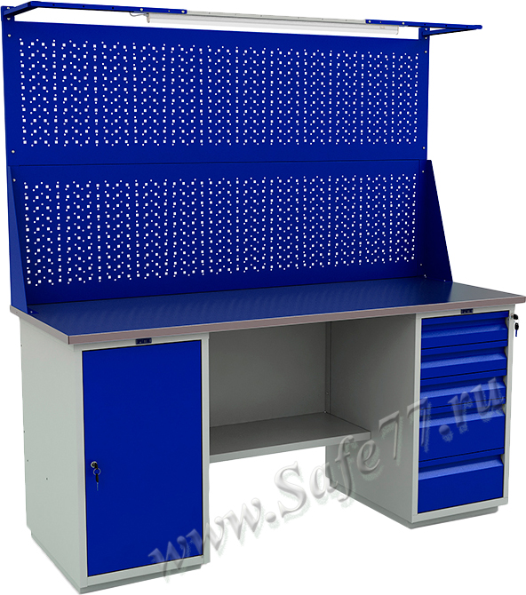 Верстак окрашен в серый цвет RAL 7038, а лицевые стороны тумб и экраны - в синий RAL 5002.